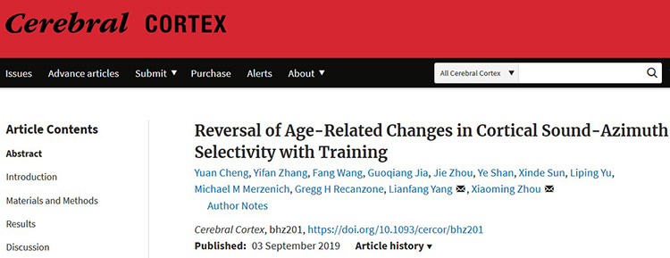 大脑功能随年龄的增加逐渐衰退是普遍的自然规律。而言语感知与声源定位能力下降则是年龄相关的脑听觉与认知功能衰退最显著的两种表现,其中声源定位对人类及其它动物的生存与交流有重要意义。先前的研究发现,大脑听觉皮层在个体的声源定位中扮演者着重要角色。那么,是否可以通过认知训练诱导听皮层神经元的方位调谐可塑性进而改善年龄相关的声源定位能力衰退?华东师大春雨直播 、脑功能基因组学教育部重点实验室周晓明教授团队近期在线发表在神经科学领域知名刊物《Cerebral Cortex》上的研究论文Reversal of age-related changes in cortical sound-azimuth selectivity with training给出了答案。